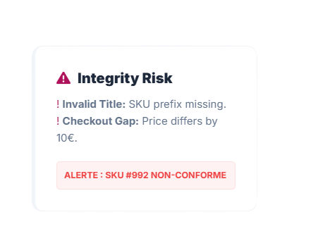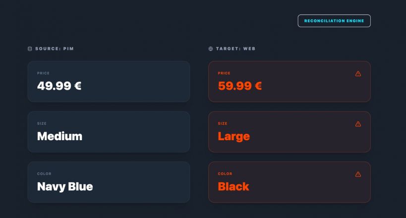 Comparaison Triple : Réconciliation automatique entre Base de données (PIM), Datalayer et Front-end réel.